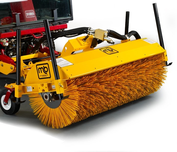 La escoba giratoria de accionamiento mecánico de 60 pulgadas (152 cm) de ancho barre áreas de estacionamiento, pasillos y césped de tierra, hojas. El operador puede inclinar el cepillo hidráulicamente 30 grados hacia la izquierda y hacia la derecha.
