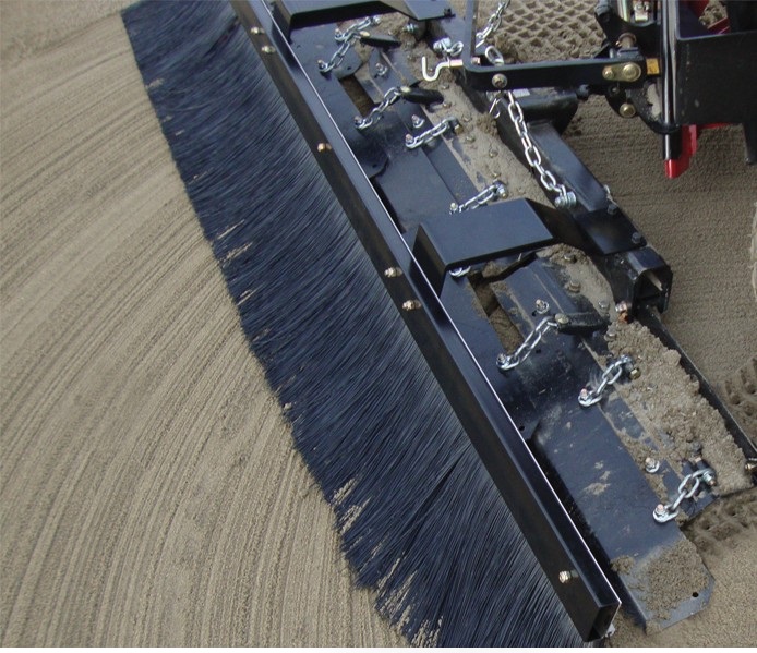 Con el QAS, cualquiera puede cambiar de un accesorio a otro en menos de un minuto, ¡sin necesidad de herramientas! Vuelva a poner sus campos rápidamente en condiciones de juego. Los accesorios incluyen: soplador de escombros, niveladora de acabado, rastrillo de dientes, sistema de soporte de tapete de arrastre, tapete de arrastre de cocoa, tapete de arrastre de acero y escoba de aseo.